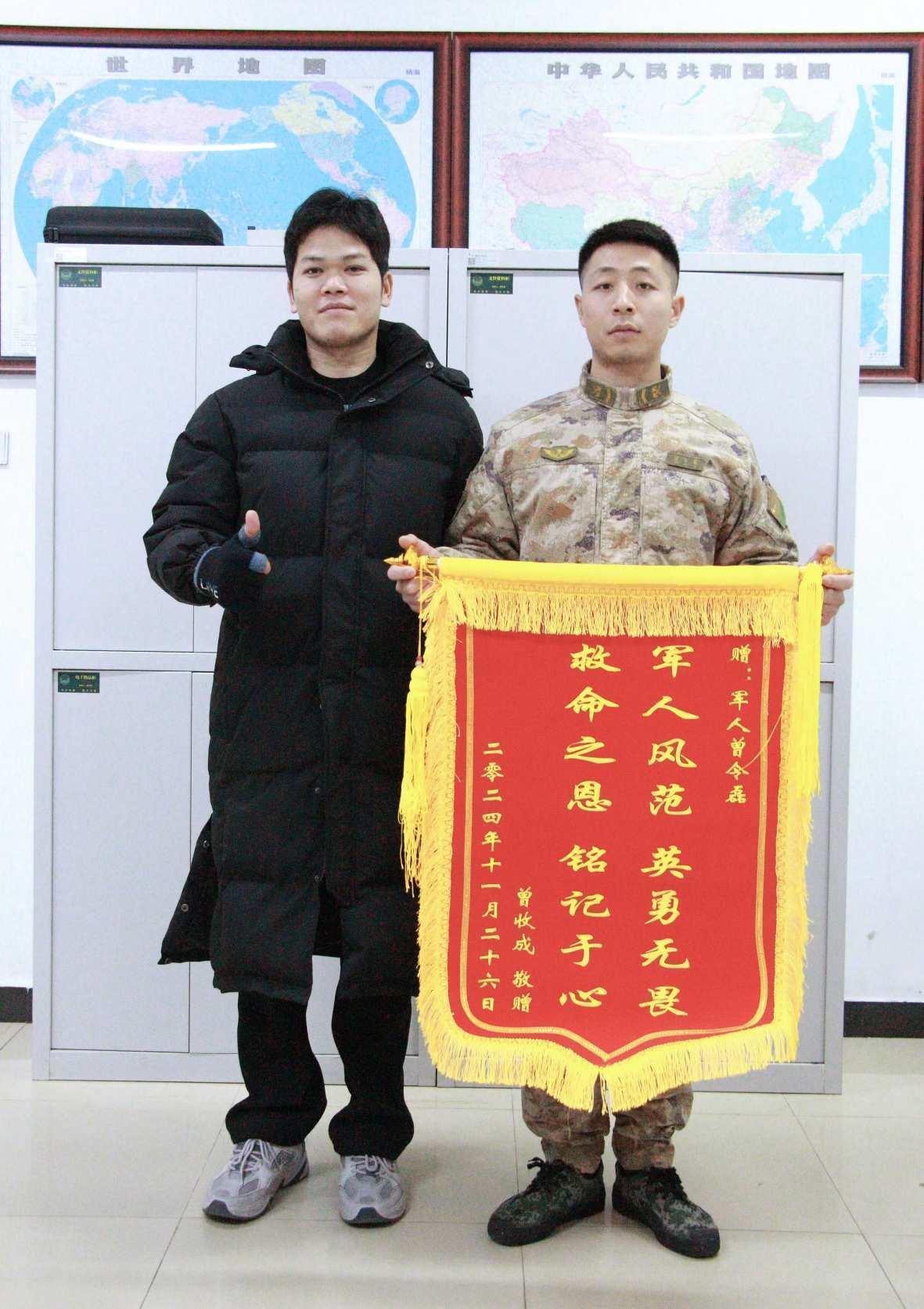 最后,曾收成通过多方找寻,于不久前还专程从广东到北京跨越2000多公里,来到曾令磊所在的部队,将一面印有“军人风范英勇无畏、救命之恩铭记于心”的烫金锦旗,亲手送到了曾令磊手中……关键时刻伸出的援手,往往是最动人的温暖传递,也是最珍贵的人性光辉。